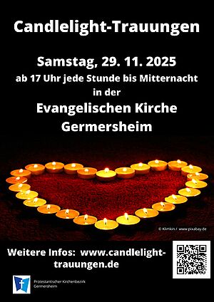Paare, die ihre kirchliche Trauung in einem besonderen Rahmen feiern wollen, haben dazu am 29. November 2025 in der Protestantischen Kirche in Germersheim die Möglichkeit. An diesem Tag, dem Samstag vor dem 1. Advent, besteht dort die Möglichkeit, sich von 17 Uhr bis Mitternacht zu jeder vollen Stunde bei einer Candlelight-Trauung das Ja-Wort zu geben. Ausführliche Informationen gibt es auf der eigens eingerichteten Internet-Seite www.candlelight-trauungen.de.